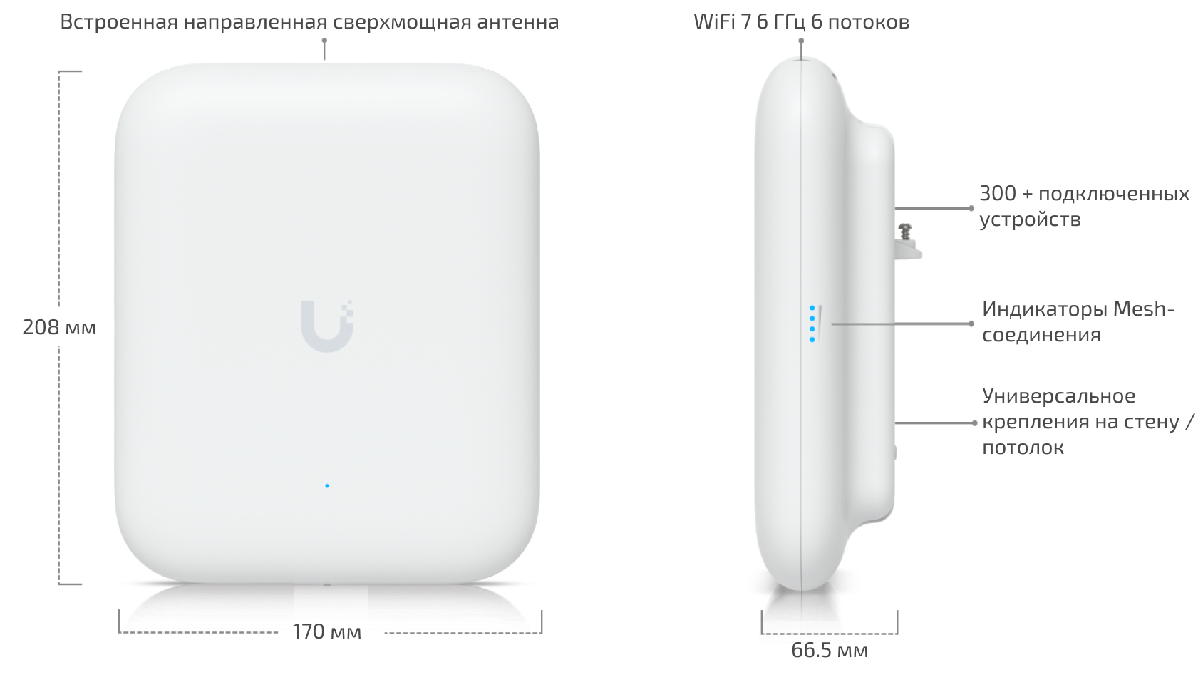 UniFi U7 Pro Outdoor — надёжное и масштабируемое решение Wi-Fi 7 для наружных сетей, где требуются высокая производительность, устойчивость и долговечность.
