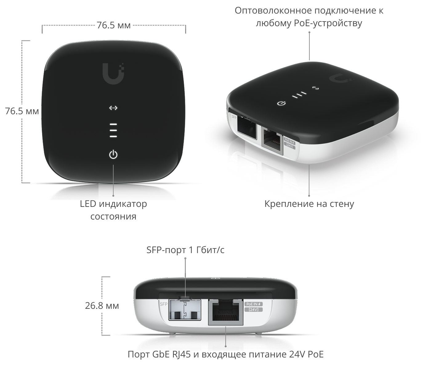Медиаконвертер UACC-AE предназначен для подключения оборудования без SFP-портов к оптоволоконным линиям. Используя SFP-модуль, он преобразует оптический сигнал в Ethernet и обеспечивает стабильный гигабитный uplink. Подходит для точек доступа, камер и другого PoE-оборудования, которому нужен оптический канал, но есть только порт RJ45.