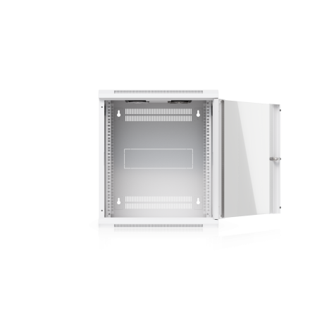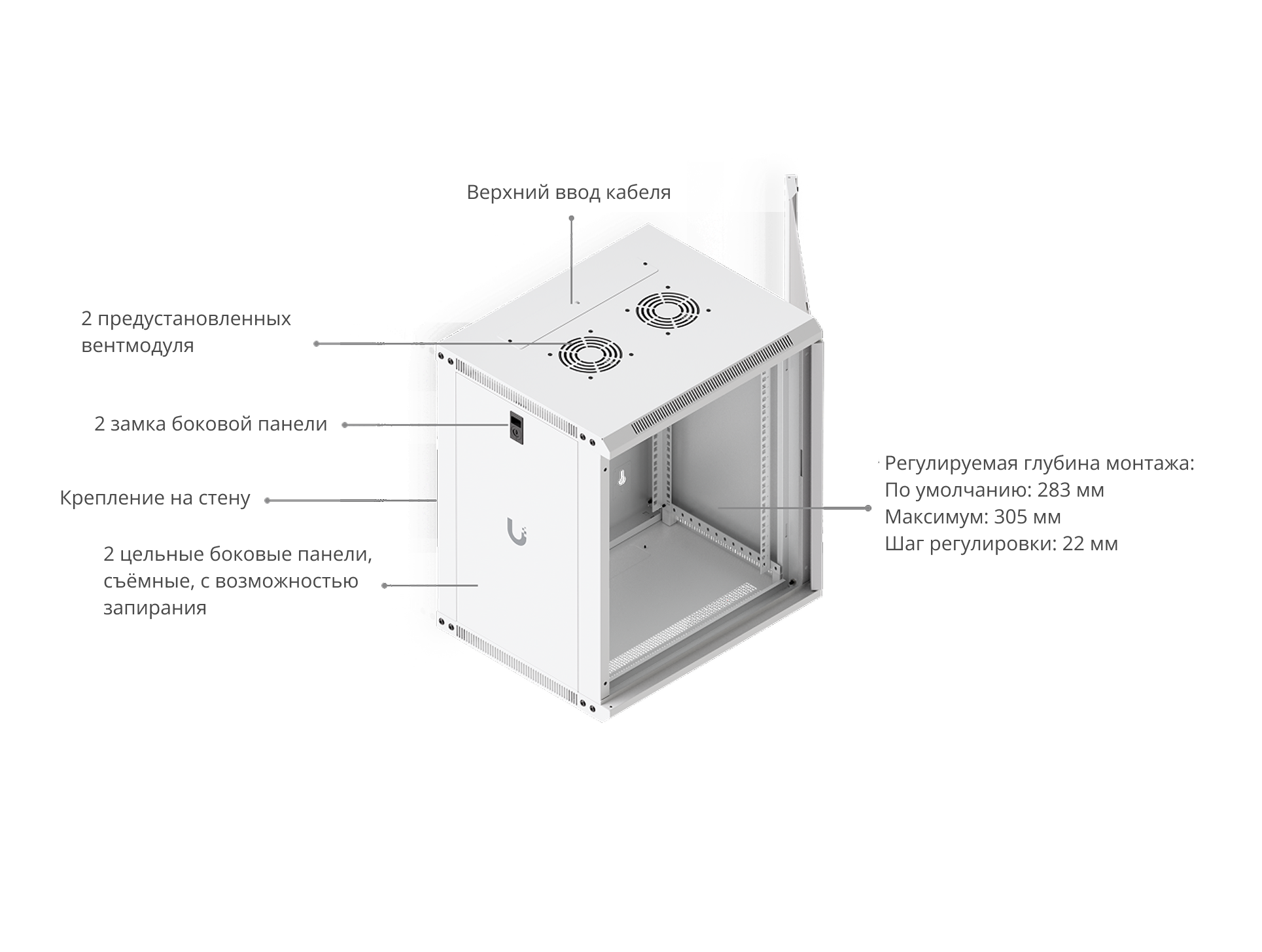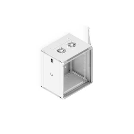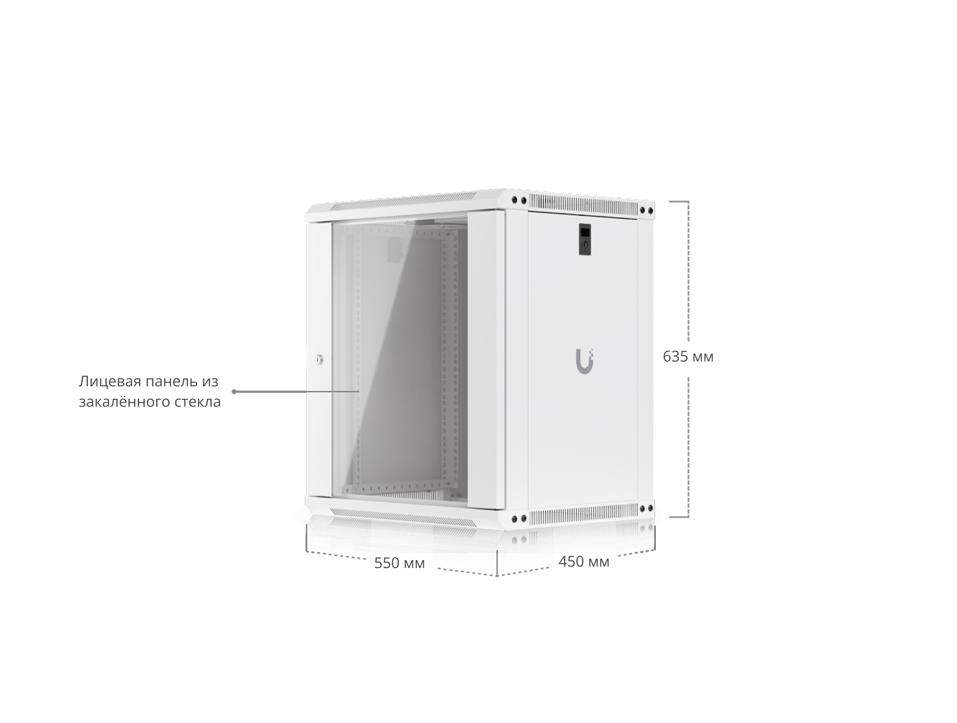 Ubiquiti 12U Rack Cabinet — настенный шкаф формата 12U с дверью из закалённого стекла. Поставляется полностью собранным, оснащён встроенным вентилятором, съёмными запираемыми боковыми панелями и удобными кабельными вводами. Подходит для размещения 19-дюймового сетевого и серверного оборудования в офисах, техкомнатах и компактных серверных.