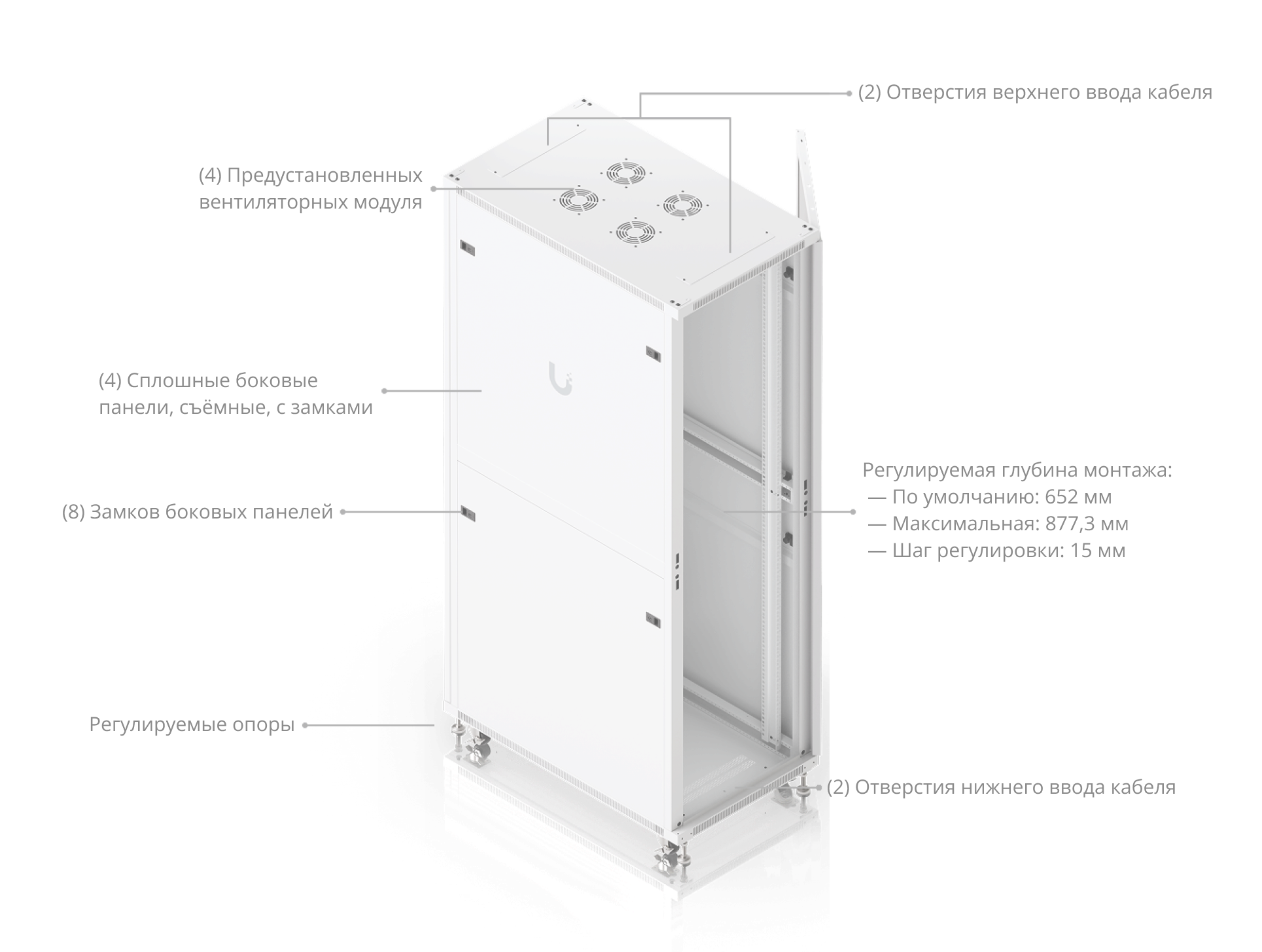 Прочная конструкция из стали с порошковым покрытием обеспечивает высокую надёжность и долговечность. Шкаф оснащён передней дверью из закалённого стекла, съёмными запираемыми боковыми панелями и регулируемой глубиной монтажа, что упрощает установку оборудования, организацию кабелей и обслуживание системы.