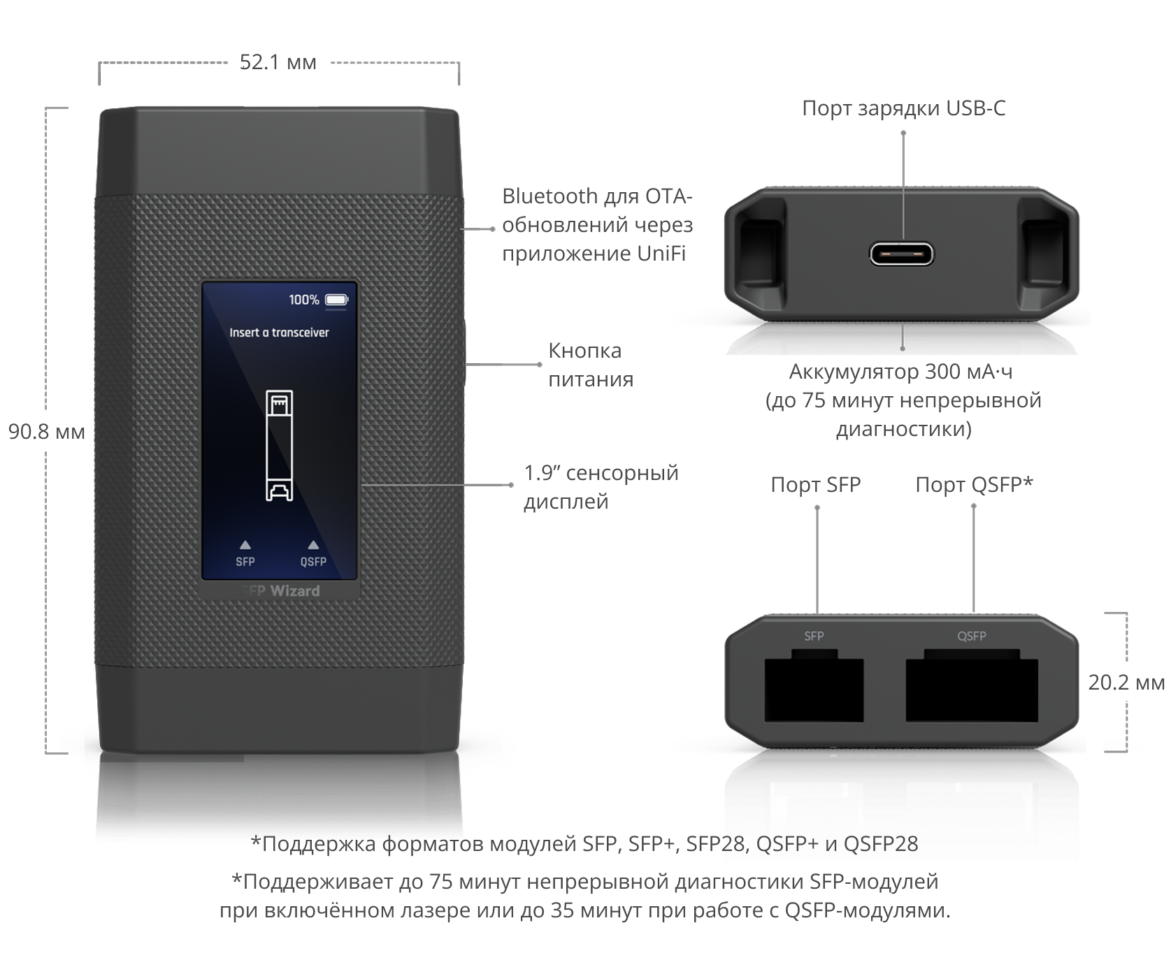 Ubiquiti SFP Wizard — это портативное устройство для настройки, тестирования и восстановления оптических модулей форматов SFP, SFP+, SFP28, QSFP+ и QSFP28. Прибор предназначен для инженеров и администраторов, которым важно быстро и удобно работать с оптическими модулями без компьютера и громоздкого оборудования.