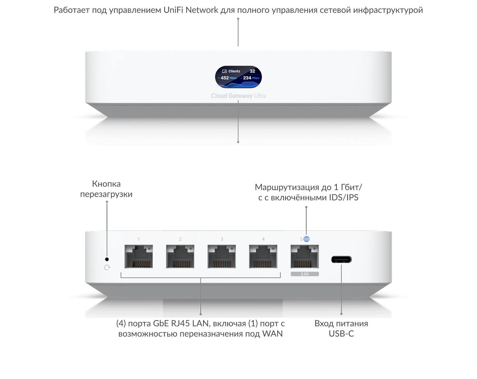 Мощный и компактный мульти-WAN шлюз UniFi Cloud Gateway с полным набором продвинутых функций маршрутизации и безопасности.