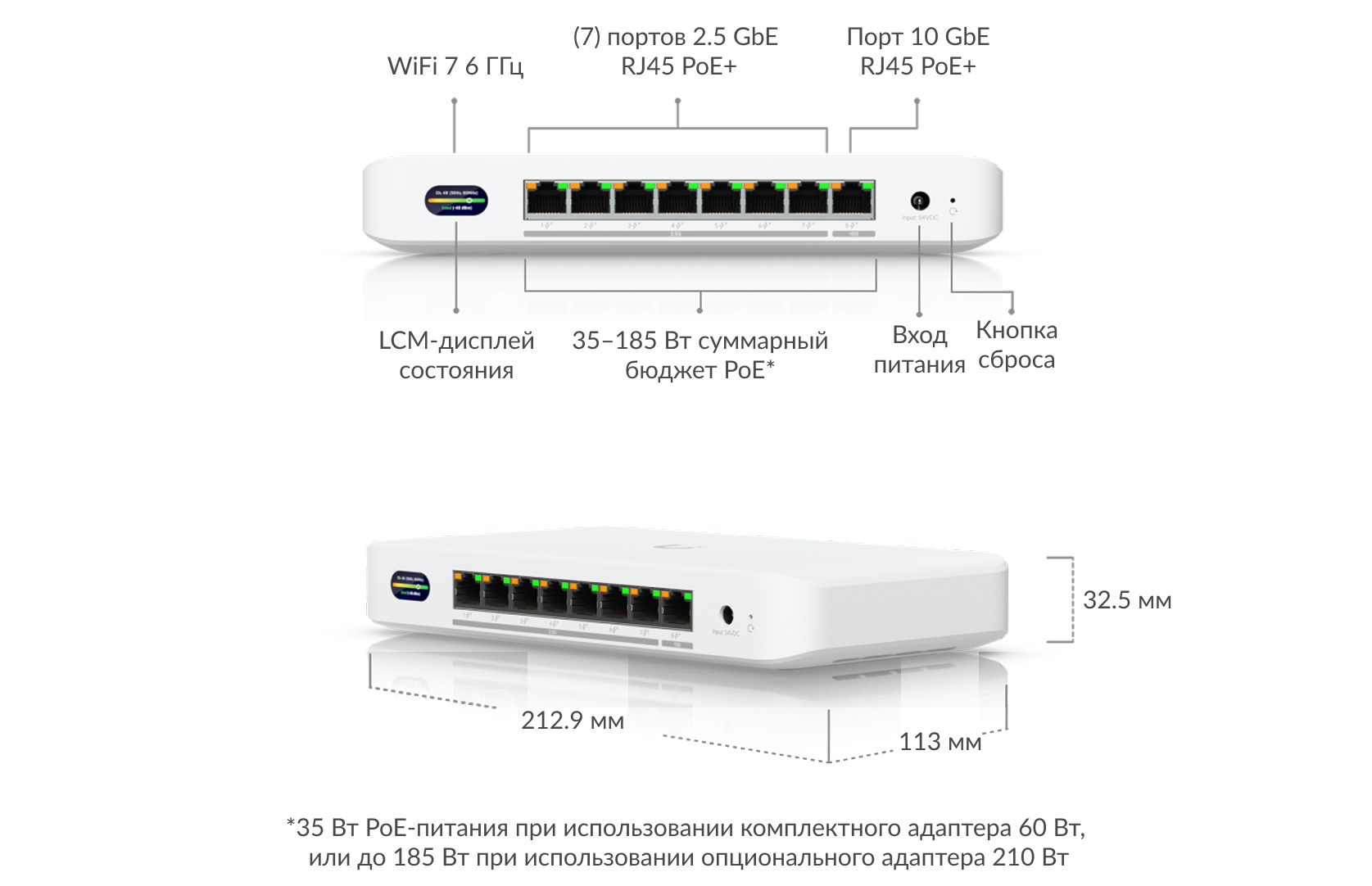 - PoE-мощность до 185 Вт — питание нескольких устройств без дополнительных источников.