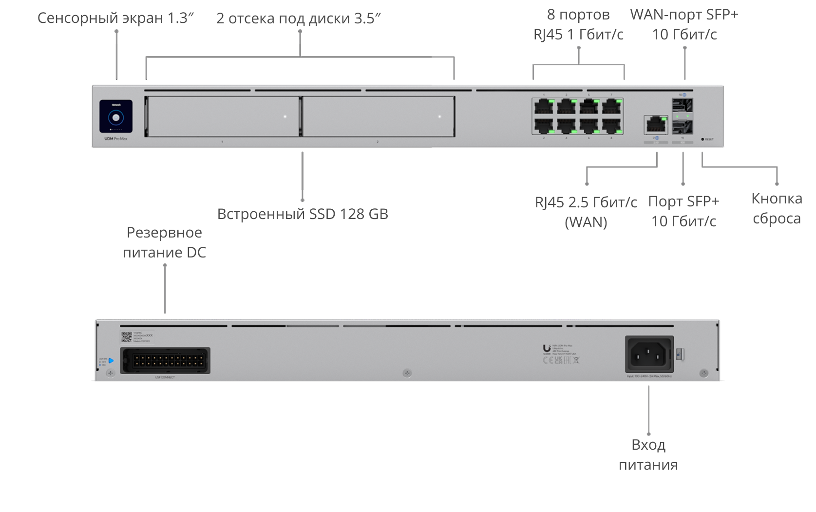 - Встроенный контроллер: UniFi Network, UniFi Protect, UniFi Access, UniFi Talk