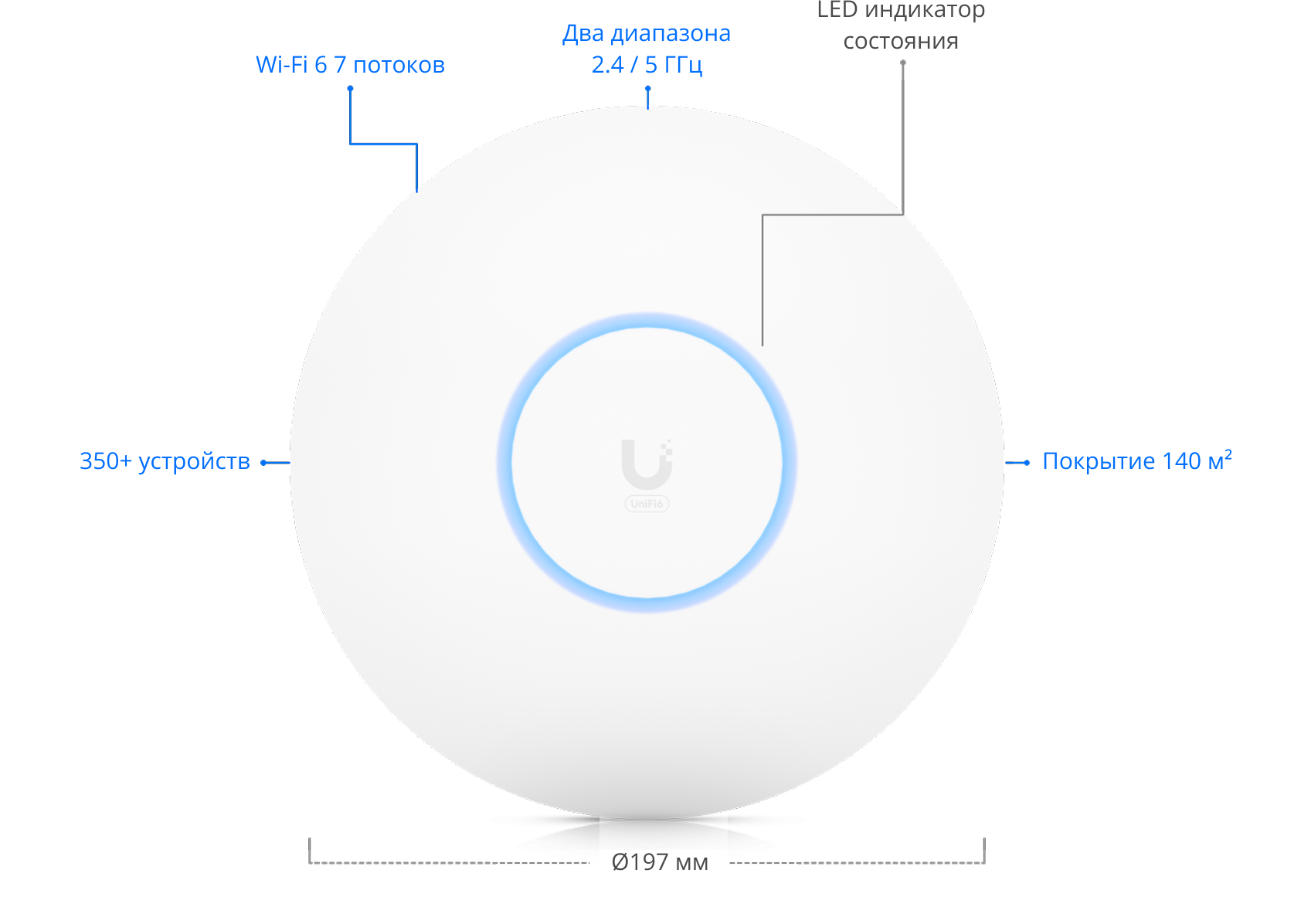 Двухдиапазонная точка доступа U6 Pro U6-Pro для монтажа на потолок или стену принадлежит линейке флагманских точек доступа и предназначена для использования в корпоративном секторе в течение продолжительного срока службы. U6 Pro долго останется актуальной, благодаря реализации высокопроизводительного протокола WiFi6. Это устройство с большим запасом механической прочности и функционала.