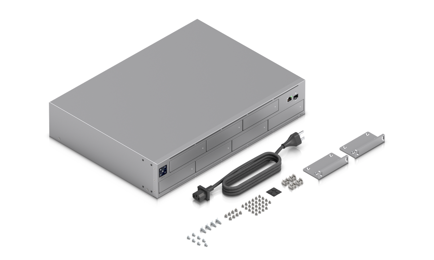 На вершине ассортимента видеорегистраторов Ubiquiti стоит Network Video Recorder Pro, обладающий обширной энергонезависимой памятью для архивации видеозаписей с множества камер наблюдения. С семью дисками по 16 ТБ каждый (модель UACC-HDD-E-16TB), этот регистратор может хранить записи в высоком разрешении 4K с 20 камер на протяжении двух месяцев.