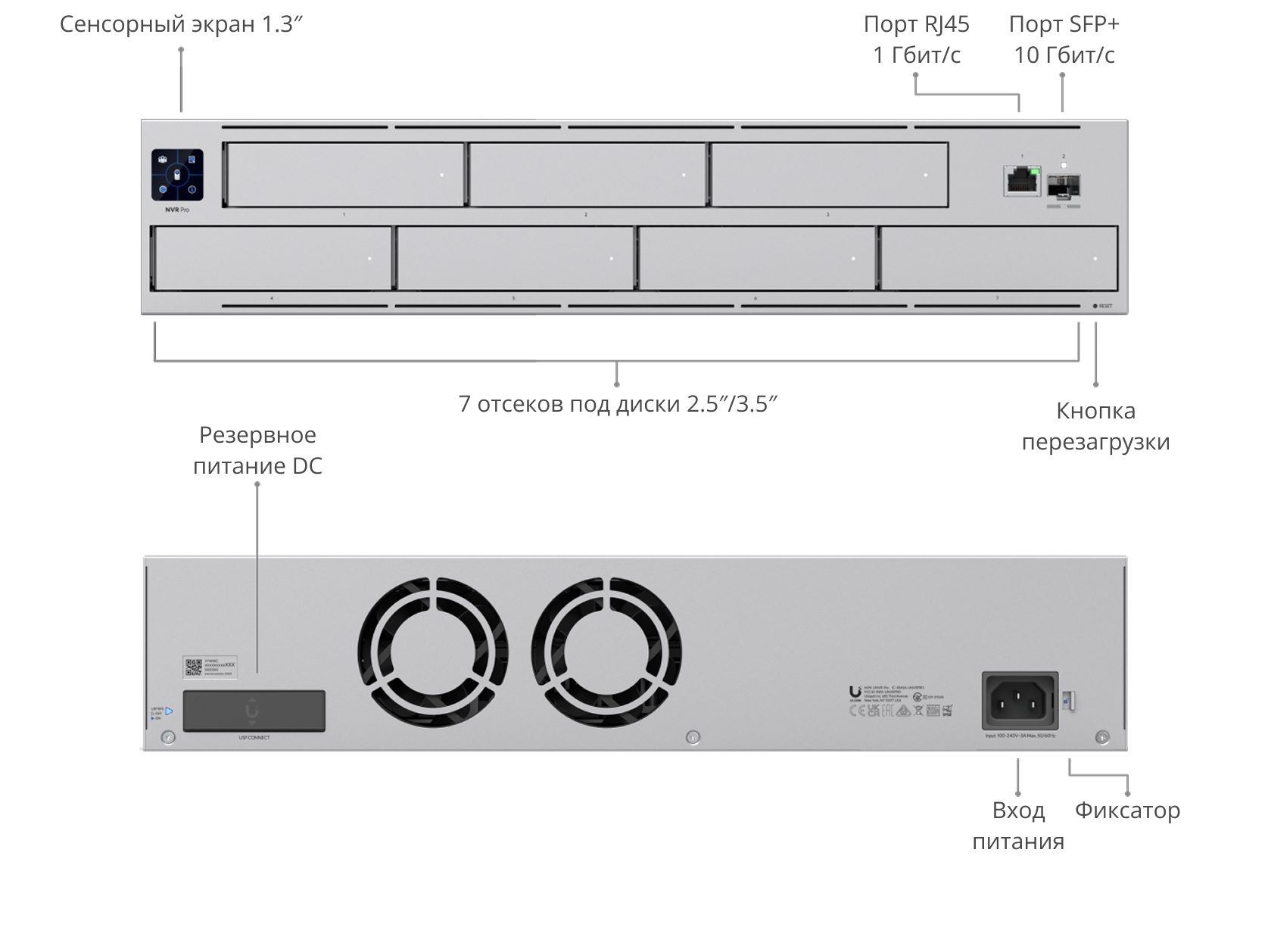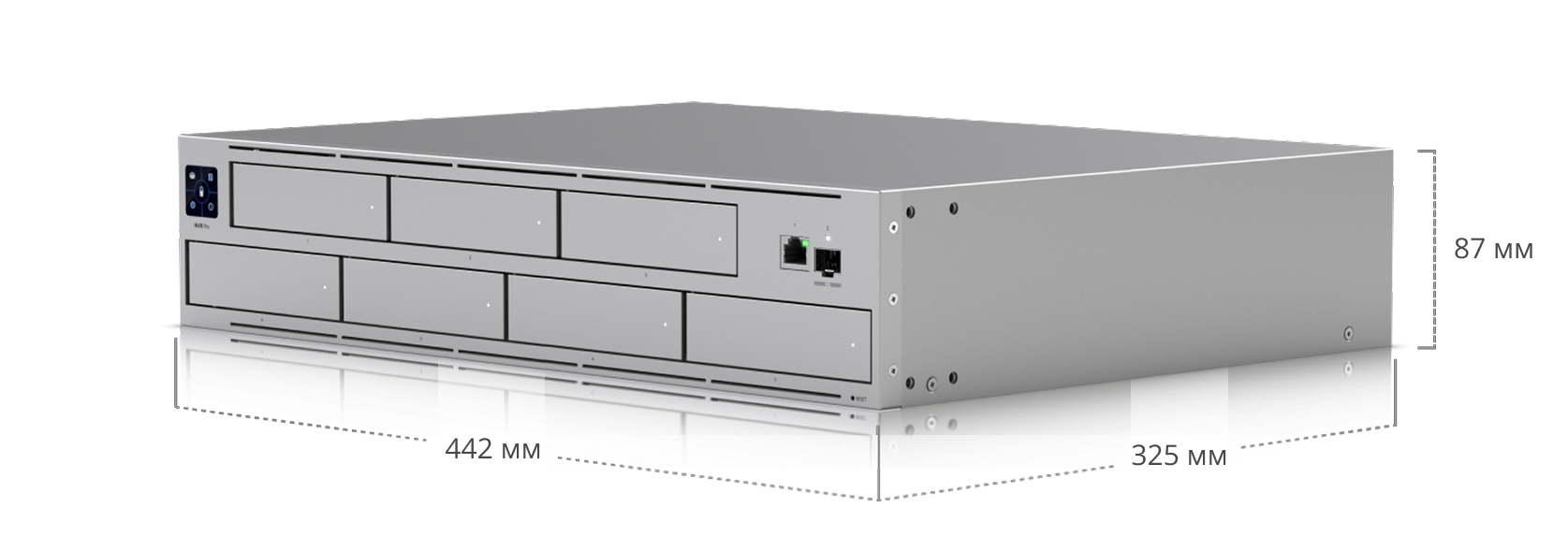 UniFi Network Video Recorder Pro - это видеорегистратор высокого уровня, предназначенный для системы видеонаблюдения UniFi Protect. UNVR-Pro способен хранить архив записей от 20 видеокамер с разрешением 4K в течение 60 дней или записи от 60 камер с разрешением HD в течение месяца*.