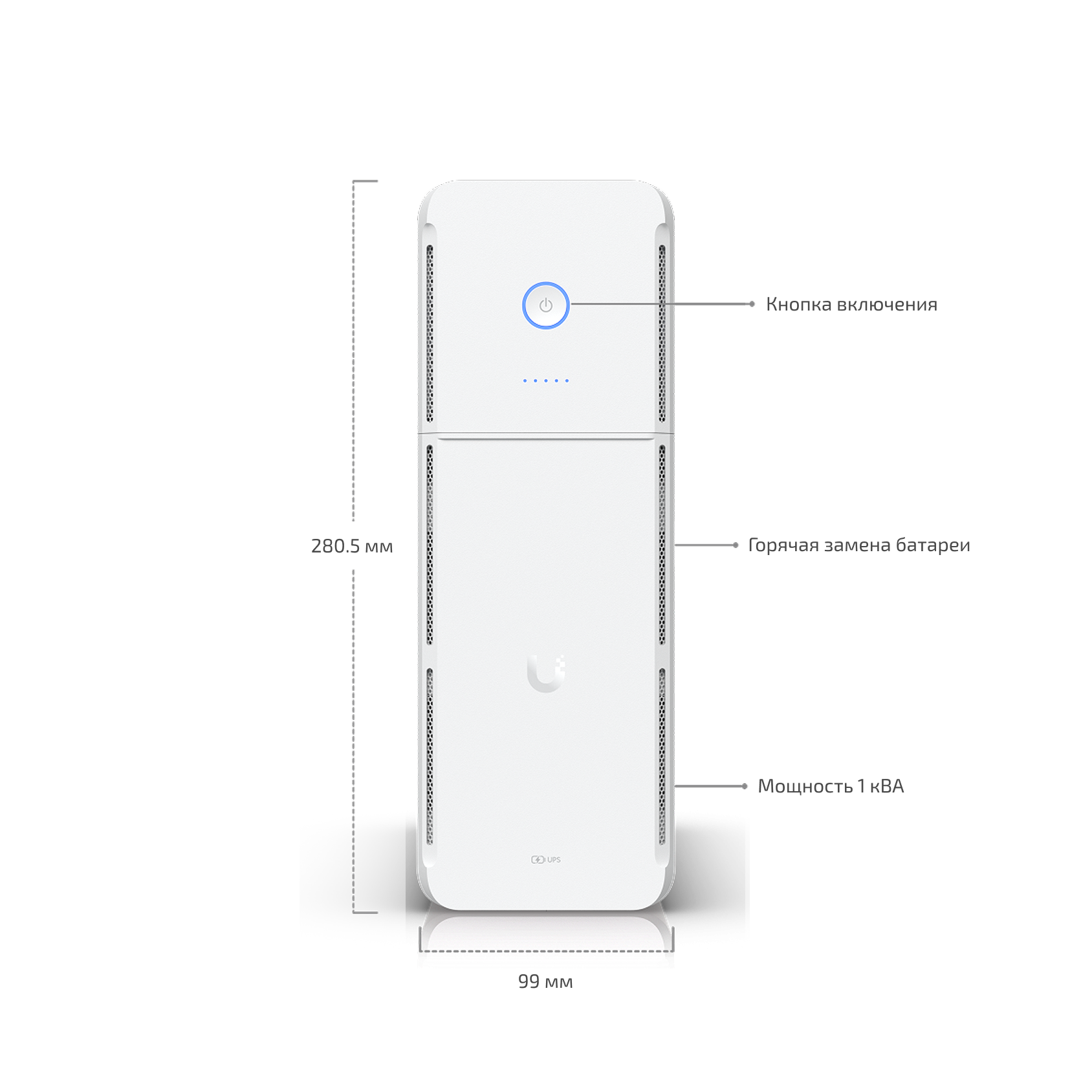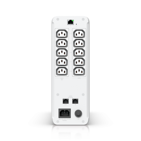 UniFi UPS Tower — современный источник бесперебойного питания мощностью 1 кВА (600 Вт) с 10 розетками и сменной батареей горячей замены ёмкостью 108 Вт·ч. Надёжно защищает сетевое и серверное оборудование от перебоев электропитания, скачков напряжения и возможных потерь данных.