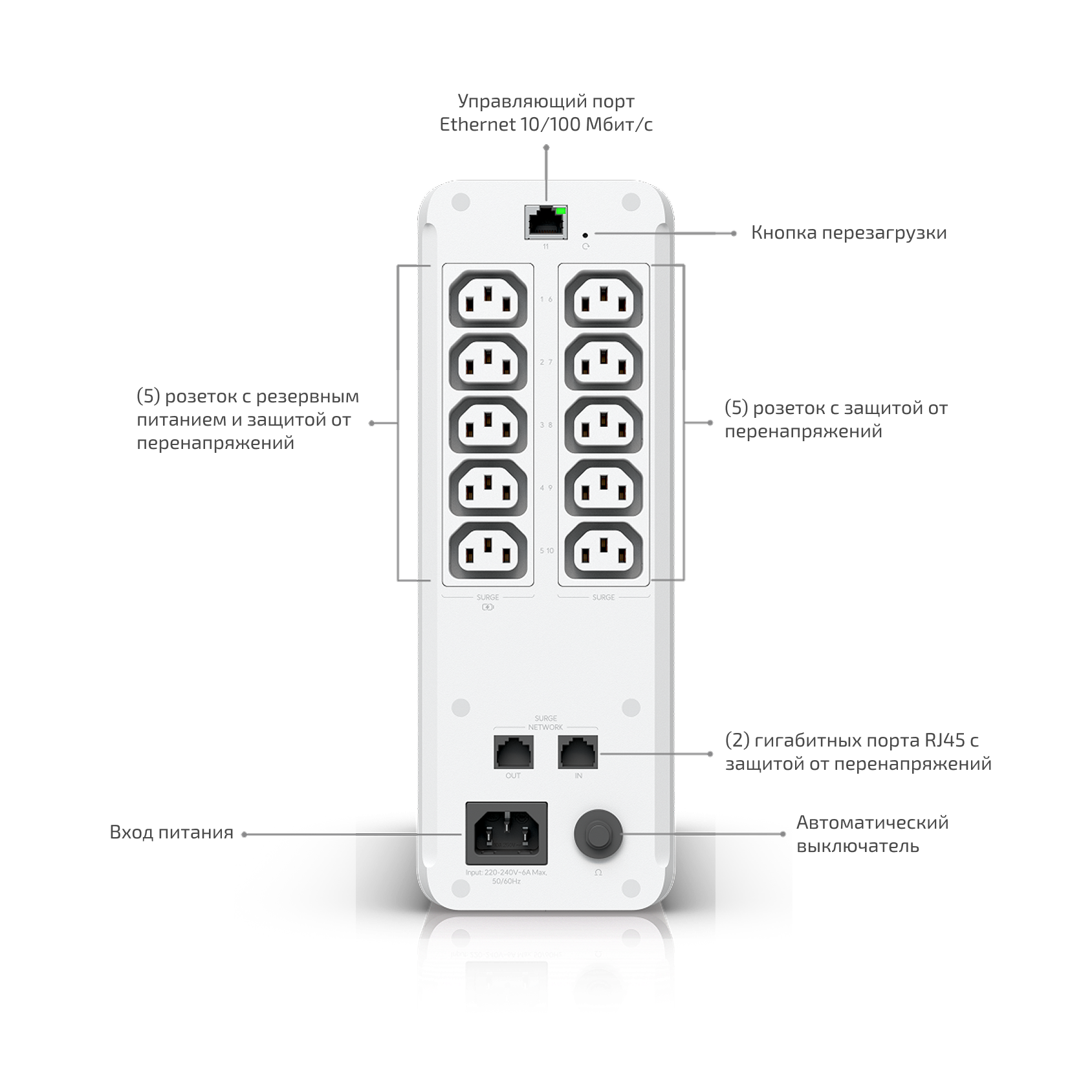 Питание | (1) Вход OVC II AC: разъём C14 (5) Розеток с резервом питания и защитой: C13 (5) Розеток с защитой от перенапряжений: C13 |