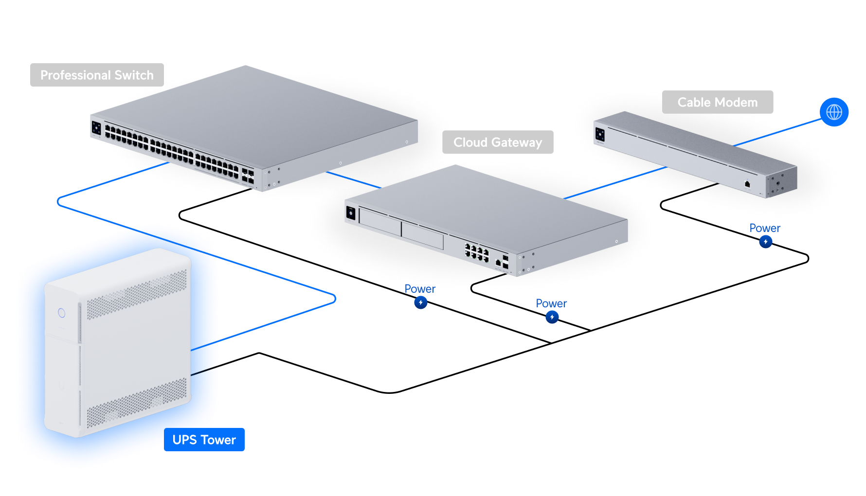 UniFi UPS Tower — компактное и надёжное решение для обеспечения бесперебойной работы серверов, маршрутизаторов и другого критически важного оборудования.