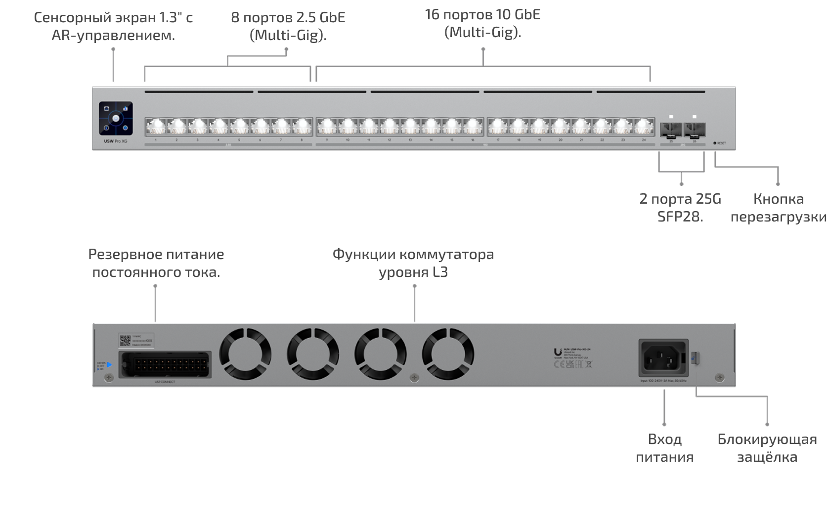 USW-Pro-XG-24 сочетает мощность корпоративного уровня и удобство управления. Он оснащён 16 портами 10 GbE, 8 портами 2.5 GbE и 2 портами 25G SFP28, поддерживает аппаратную маршрутизацию L3 и полностью интегрируется с UniFi Network для централизованного контроля и мониторинга.