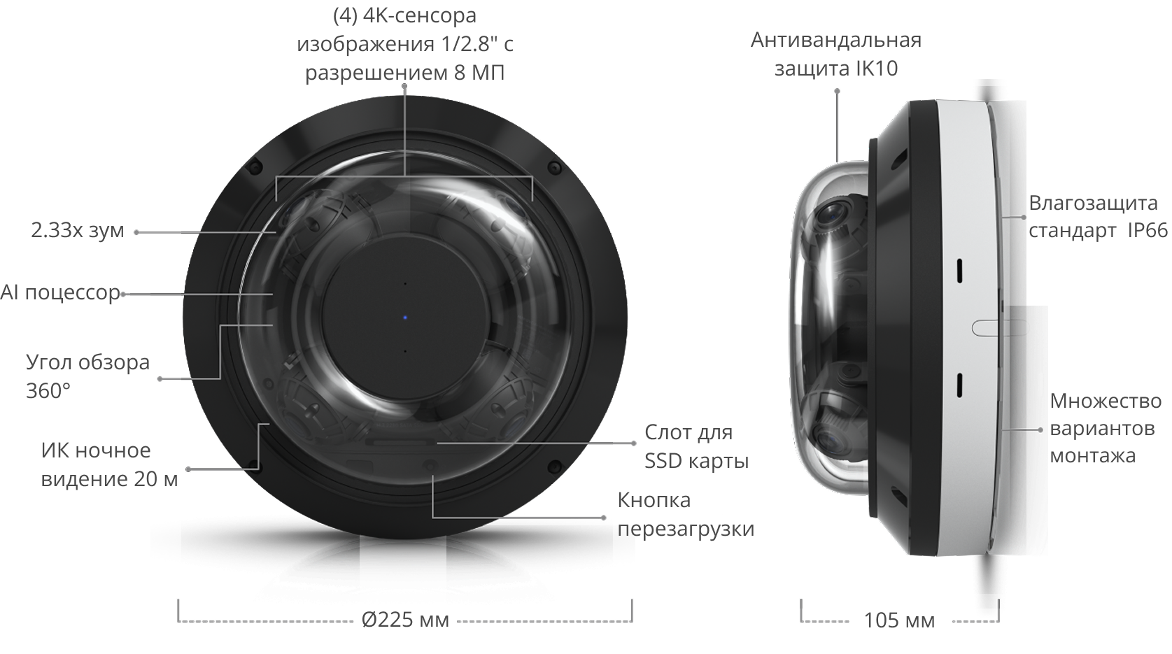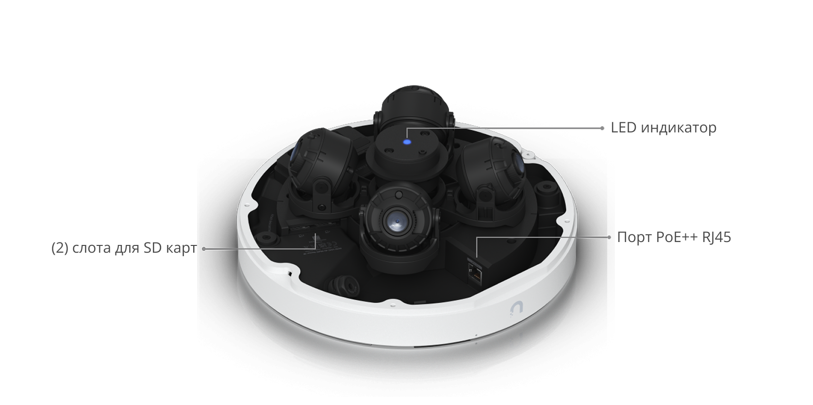Каждый объектив можно независимо поворачивать вокруг кругового корпуса, устанавливая нужный угол обзора. Линзы можно настроить для полного кругового покрытия на 360° или для съёмки отдельных зон с помощью оптического зума.
