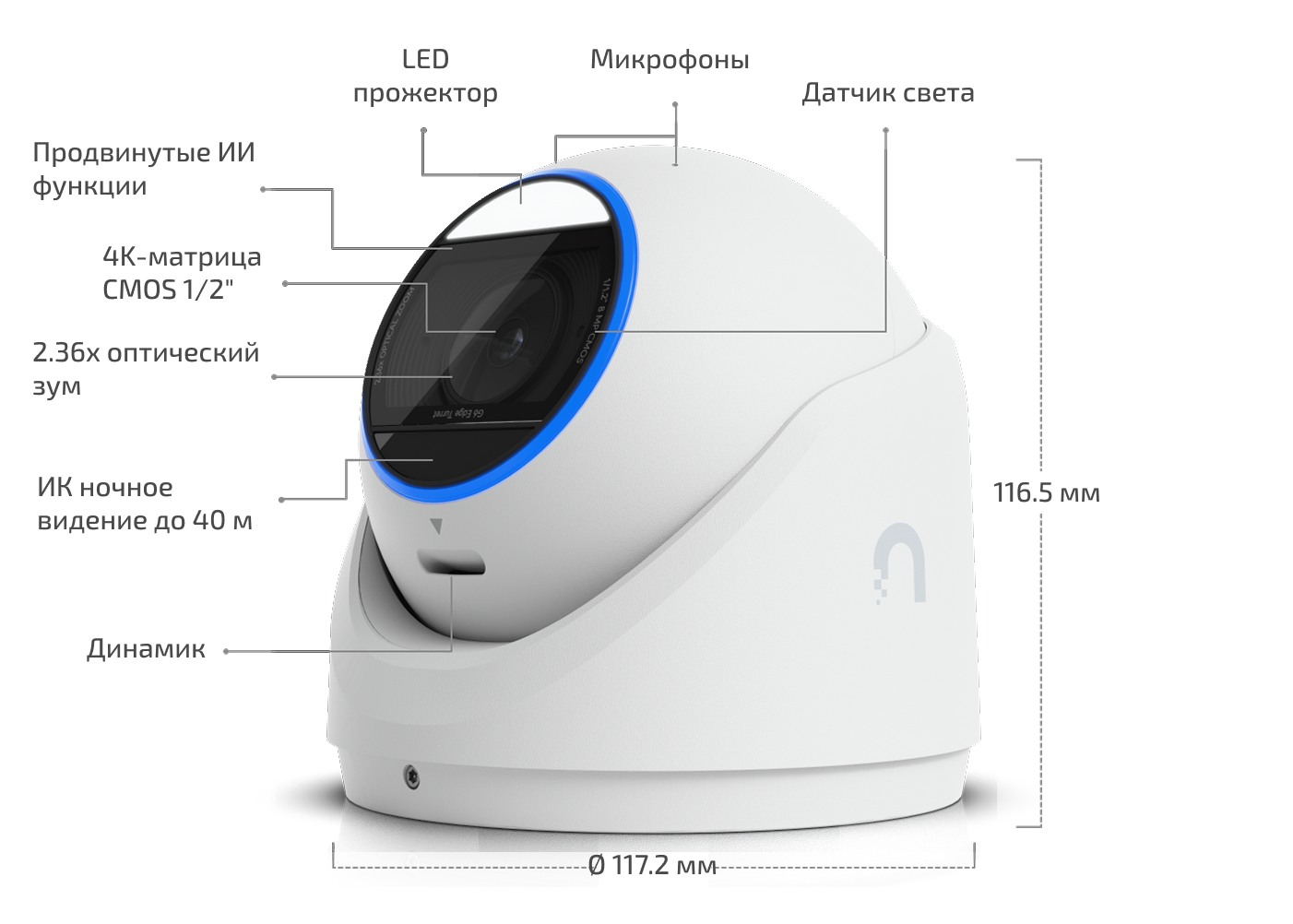 Ubiquiti UniFi G6 Edge Turret — 4K IP-камера с Edge AI для стабильного видеонаблюдения 24/7 внутри и на улице. Крупный сенсор обеспечивает чёткое изображение, уверенную работу в условиях слабого освещения и точную аналитику без необходимости в отдельном регистраторе.